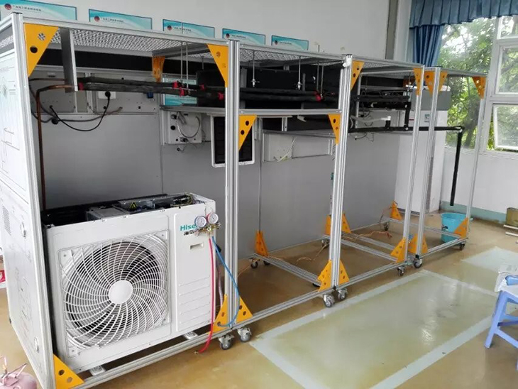 實(shí)訓(xùn)裝置采用移動(dòng)框架4040鋁型材結(jié)構(gòu),安裝好后可固定位置,防止移動(dòng)而牽動(dòng)制冷系統(tǒng)管路。整個(gè)模擬房頂采用1.5MM的網(wǎng)多功能網(wǎng)孔板設(shè)計(jì)使用專業(yè)家用中央空調(diào)專用吊架。掛壁式后安裝板同樣也采用的網(wǎng)多功能網(wǎng)孔板設(shè)計(jì).